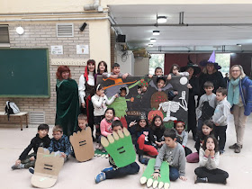 El patio interior se llenó de monstruos, fantasmas, brujas, vampiros, frankensteins, esqueletos, brujos, calabazas y otros seres terroríficos, daban mucho miedo pero tod@s muy "apretadicos" pasamos una tarde llena de diversión.